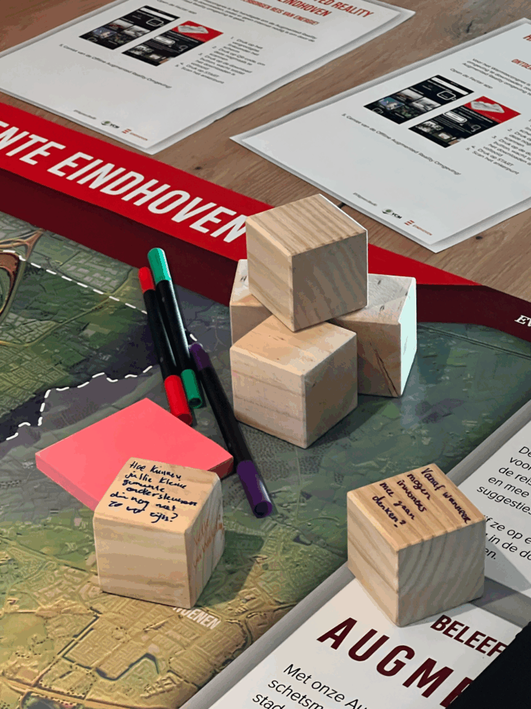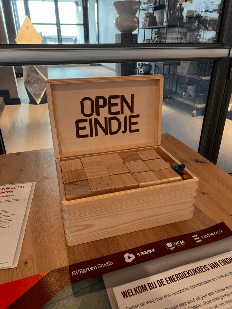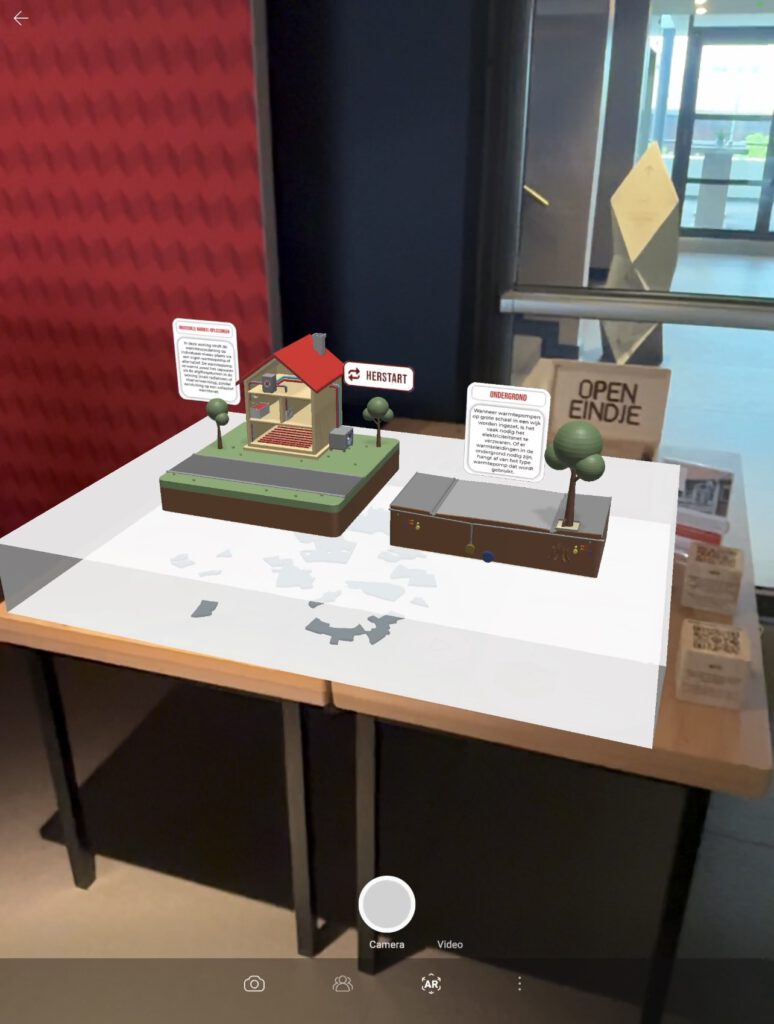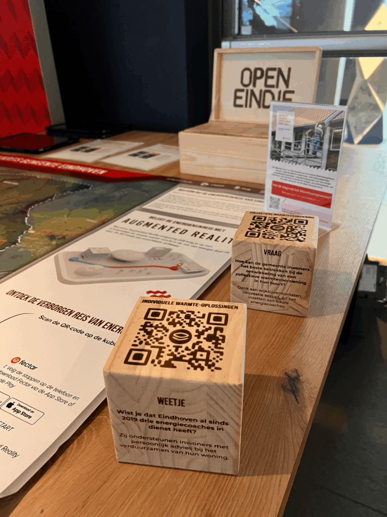 - Fysieke objecten: een poster, een open doos en twee kubussen met QR-codes. Scan ze en stap in de AR-wereld.
